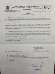 According to the magistrate’s order, although the district administration of Itanagar Capital Region adheres to the secular spirit of the Indian Constitution, the open display of the word “beef” on hotel and restaurant signboards may offend some members of the community and foster hostility between various groups.