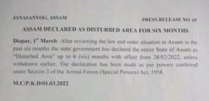 In an official statement state government stated, “As per powers conferred under Section 3 of the Armed Forces (Special Powers) Act, 1958, the Governor of Assam has declared the entire state of Assam as ‘disturbed area’ up to six months with effect from February 28, 2022, unless withdrawn earlier.”