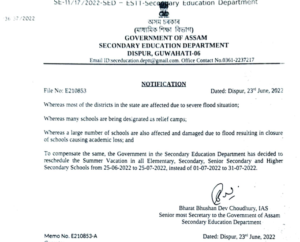 Guwahati: Assam Education Minister Ranoj Pegu on Thursday announced that the summer break for students will begin on June 25 and last on July 25. The minister announced that due to the state’s deteriorating flood situation, the summer break has been postponed by a few days.
