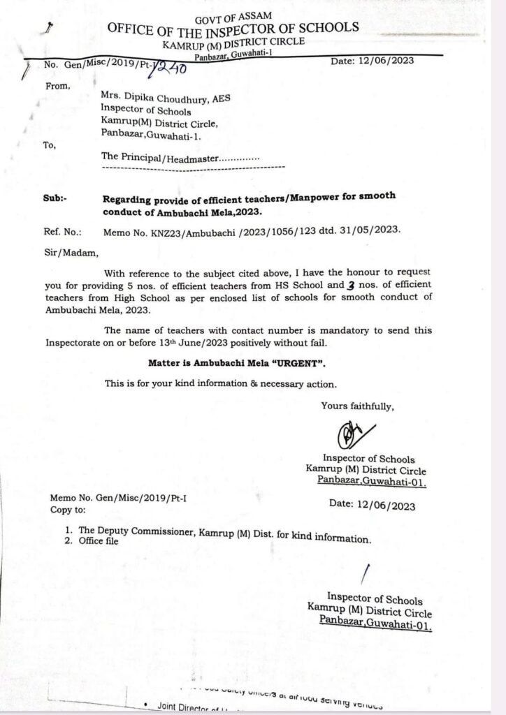 In a notification from the Inspectors of Schools, Kamrup (M) District Circle reads, “With reference to the subject cited above, I have the honour to request you for providing 5 nos. of efficient teachers from HS School and 3 nos. of efficient teachers from High School as per the enclosed list of schools for smooth conduct of Ambubachi Mela, 2023.”