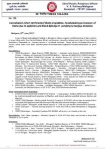 Guwahati: The Northeast Frontier Railway (NFR) cancelled, short-terminated, rescheduled, and diverted several trains in response to widespread agitation that resulted in railway property damage, including the burning of train coaches in areas served by the East Central Railway (Bihar) and damages to railway tracks caused by flood-induced breaches in the Lumding & Harisinga and Tangla sections of the Rangiya divisions of Assam.
