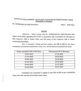 Guwahati: The Physical Standard Test and Physical Efficiency Test (PST & PET) for the 306 posts of Sub Inspector (UB) in Assam Police and 320 posts of Sub Inspector (AB) in Assam Commando Battalions which were scheduled to begin on June 20, 2022, have been rescheduled due to incessant rain and bad weather in the state.