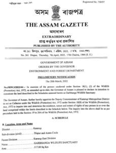 A notification issued by the Assam government said, “In exercise of the powers conferred under Section 18(1), (2) of the Wildlife (Protection) Act, 1972, as amended up-to-date, the governor of Assam is pleased to declare its intention to constitute the land described in the Schedules annexe here to as Garbhanga Wildlife Sanctuary.”