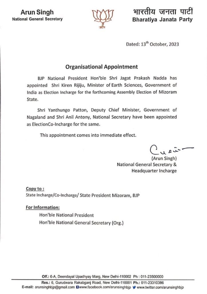 Northeast Desk, 13th October: BJP National President, Jagat Prakash Nadda, has announced the appointment of Kiren Rijiju, the Minister of Earth Sciences in the Government of India, as the Election Incharge for the upcoming Assembly Election in Mizoram State.
