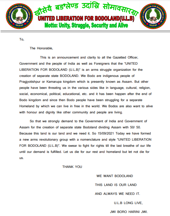 The organization in a statement said that ULB is an arms struggle organization for the creation of a separate state Bodoland.