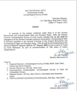 According to an official order by the Archaeological Survey of India (ASI), All Indian citizens and foreign visitors are now permitted free entrance to the monuments managed by the ASI.