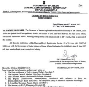 Guwahati: On the occasion of Holi and Dol Jatra, the Assam government has announced Saturday (March 19) as a local holiday in the Kamrup (Metro) district.