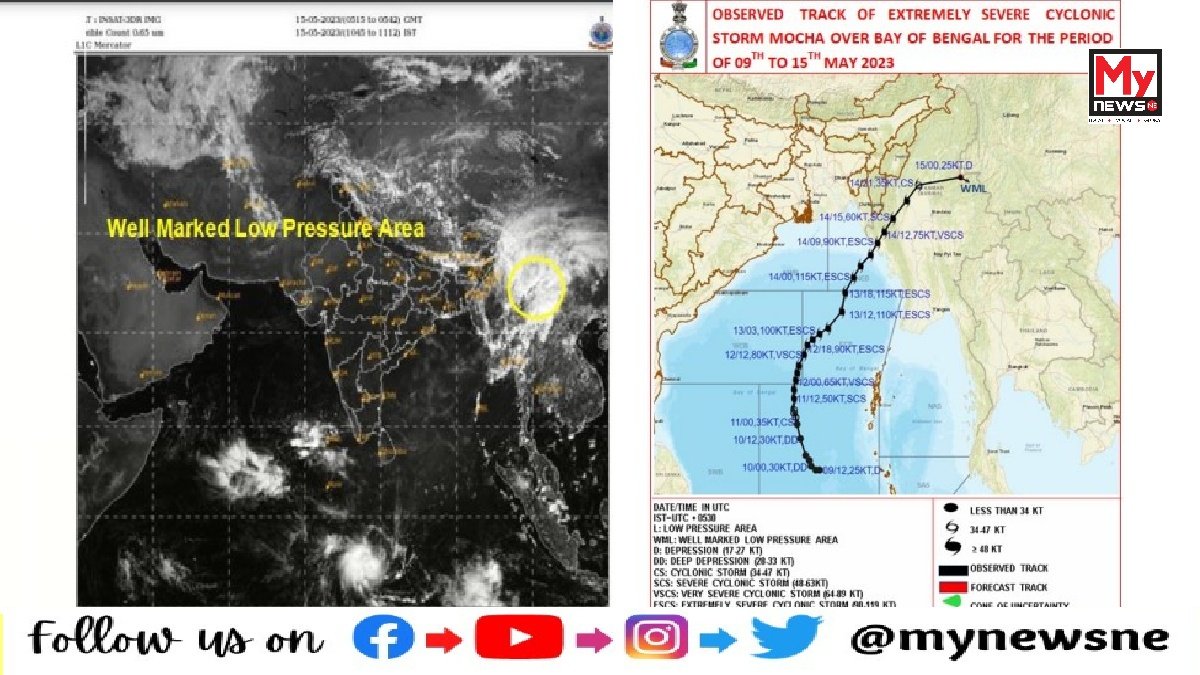 National Desk, 15 May: India Meteorological Department (IMD) reported on Monday afternoon that the depression over Myanmara remnant of Cyclonic Storm “Mocha” which is pronounced “Mokha” moved southeast weakened into a clearly defined low-pressure area and was centred at 8:30 am today over northeast Myanmar and the surrounding area.