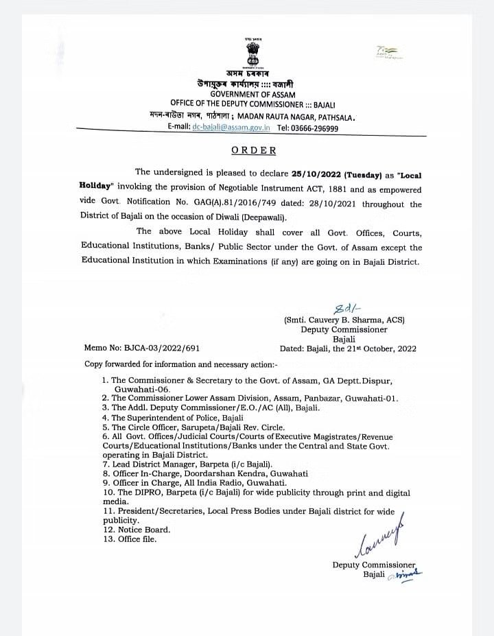 Guwahati: The Bajali District Administration has declared a local holiday in across the district on October 25 (Tuesday) on account of Diwali.