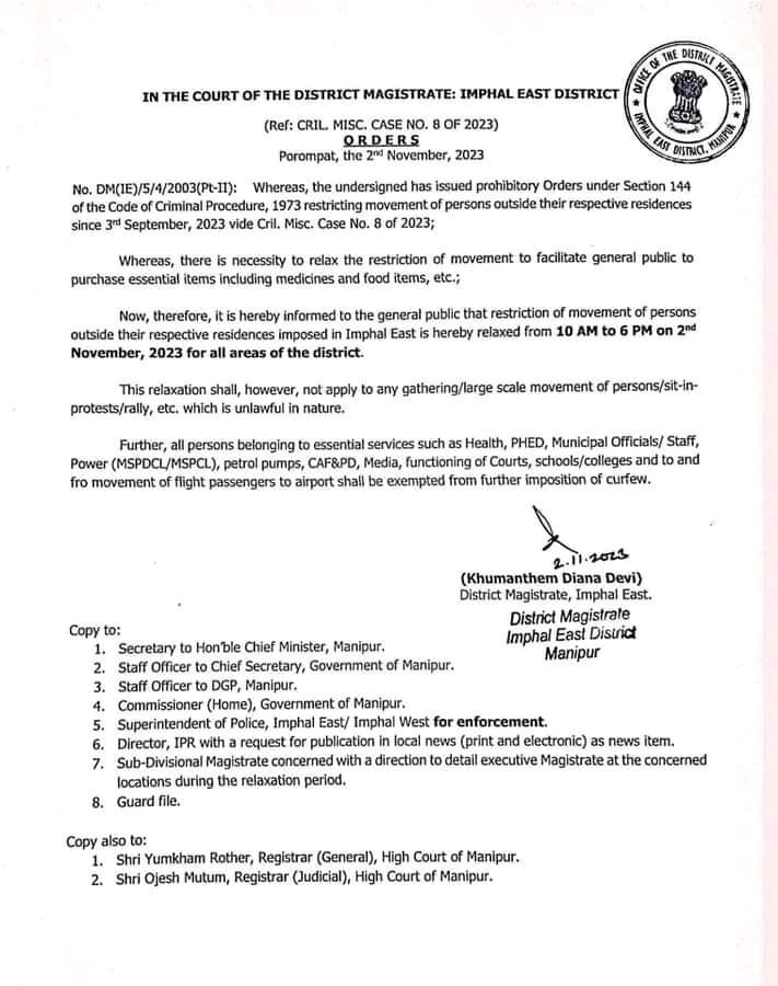 According to the directive, the movement restrictions for the general public in all areas of Imphal West and Imphal East districts will be lifted on November 2, 2023, from 10 am to 6 pm. However, it’s essential to note that this relaxation doesn’t permit gatherings, sit-in protests, rallies, etc., without prior approval from the competent authority.