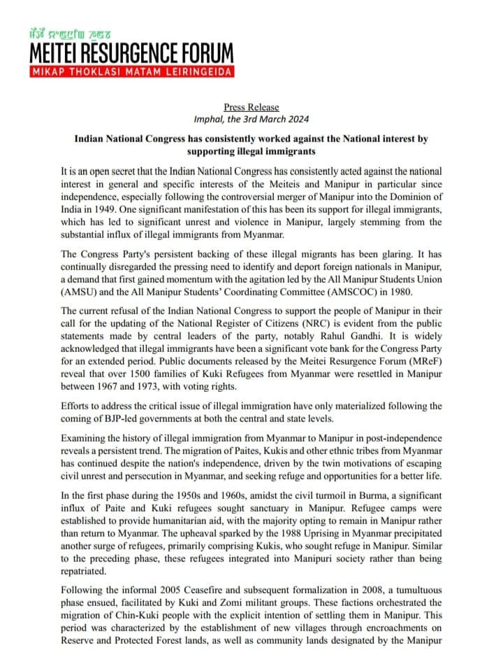 “The current refusal of the Indian National Congress to support the people of Manipur in their call for the updating of the National Register of Citizens (NRC) is evident from the public statements made by central leaders of the party, notably Rahul Gandhi. It is widely acknowledged that illegal immigrants have been a significant vote bank for the Congress Party for an extended period. Public documents released by the Meitei Resurgence Forum (MReF) reveal that over 1500 families of Kuki Refugees from Myanmar were resettled in Manipur between 1967 and 1973, with voting rights,” said the MRF.