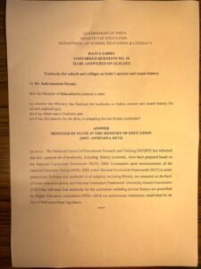 MoS of education ministry replied, “The National Council of Educational Research and Training (NCERT) has informed that their -present set of textbooks, including History textbooks, has been prepared based on the National Curriculum Framework (NCF), 2005. Consequent upon announcement of the National Education Policy (NEP), 2020, a new National Curriculum Framework (NCF) is under preparation. Syllabus and textbooks in all subjects, including History, are prepared on the basis of extant education policy and National Curriculum Framework. University Grants Commission (UGC) has informed that textbooks for the curriculum including ancient history are prescribed by Higher Education Institutions (HEls) which are autonomous institutions established by an Act of Parliament/State legislature.”