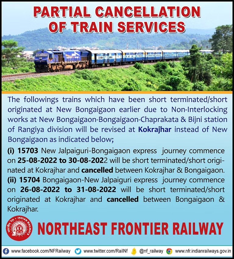 The trains include, Train No. 15703 New Jalpaiguri–Bongaigaon will short terminated/short originated at Kokrajhar instead of Bongaigaon and cancelled between Kokrajhar and Bongaigaon that will commence on August 25-30.