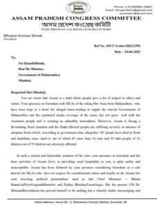 “In such a critical and deplorable situation of the state, your presence in Guwahati and the busy activities of Assam Govt. in providing royal hospitality to you, is quite unfair and unacceptable. Assam has been defamed by your presence considering Guwahati as a safe haven for MLAs who have no respect for constitutional values and loyalty at all,” he added.