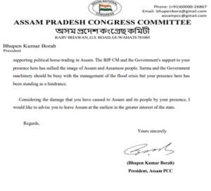 He wrote, “But the present CM Dr. Himanta BiswaSarma has proved himself to be nothing but a wheeler dealer encouraging and supporting political horse-trading in Assam. The BJP CM and the Government’s support to your presence here has sullied the image of Assam and Assamese people. Sarma and the Government machinery should be busy with the management of the flood crisis but your presence here has been standing as a hindrance.”