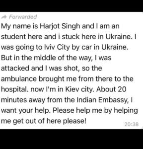 Singh speaking from the Kyiv City Hospital,”The bullet entered from my shoulder. They took out a bullet from my chest… my leg was fractured”.